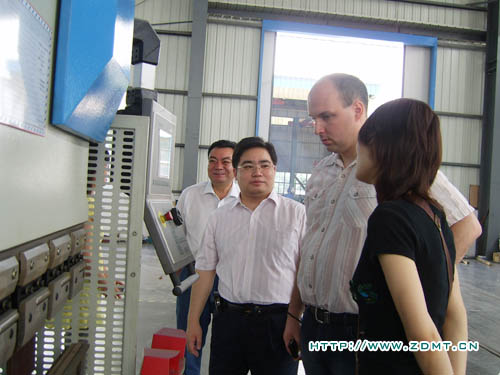 在中德公司領導的陪同下,尼爾森先生來到了我們的車間。尼爾森先生尤其關注數(shù)控類機床,對數(shù)控機床成品都一一細細查看。在正在生產(chǎn)中的大型數(shù)控雙機聯(lián)動折彎機前,尼爾森表現(xiàn)出了極大的興趣,認真的向負責人了解機器的情況。在大型裝配車間,尼爾森一行對中德車間的管理布局及環(huán)境表示了贊揚,雖然天氣很熱,干凈整潔的車間環(huán)境讓他們輕松地進行參觀。另外,負責人還向他們介紹了產(chǎn)品設計方面的一些小細節(jié)如夾塊、T型槽等等,這些細節(jié)體現(xiàn)出了中德產(chǎn)品使客戶在使用產(chǎn)品過程中將會得到極大的便利。