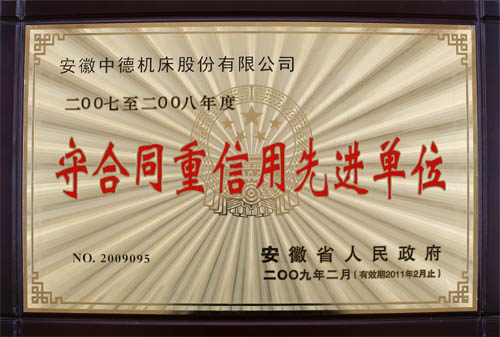 近日,我公司榮獲由安徽省人民政府頒發(fā)的二〇〇七至二〇〇八年度“守合同重信用先進單位”榮譽稱號(證書號:2009095,有效期止2011年2月),也是我公司第二次獲得此項殊榮。