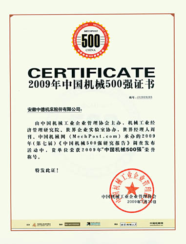 由中國機(jī)械工業(yè)企業(yè)管理協(xié)會主辦,機(jī)械工業(yè)經(jīng)濟(jì)管理研究院、世界企業(yè)實驗室協(xié)辦,世界經(jīng)理人周刊、中國機(jī)械網(wǎng)承辦的2009年(第七屆)《中國機(jī)械500強(qiáng)研究報告》調(diào)查活動公布,中德機(jī)床榮獲2009年“中國機(jī)械500強(qiáng)”。